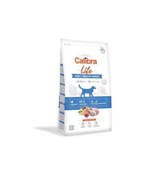 Calibra Dog Life Adult Medium Breed Chicken– kompletné superprémiové suché krmivo s vysokým obsahom kuracieho mäsa predospelé psy stredných plemien(10-30 kg). Základom tejto hypoalergénnej receptúry sú kvalitné živočíšne proteíny, ktoré tvoria 90 % z celkového obsahu bielkovín, a nízky obsah obilnín (iba ryža). Vďaka pridaným prebiotikám a probiotikám granuly vyhovujú potrebám na nastavenieoptimálneho trávenia.K posilneniuimunitného systémuďalej prispieva vybraný mix vitamínov a minerálov. Receptúra tak poskytuje významnú podporu pre aktívny život psa.