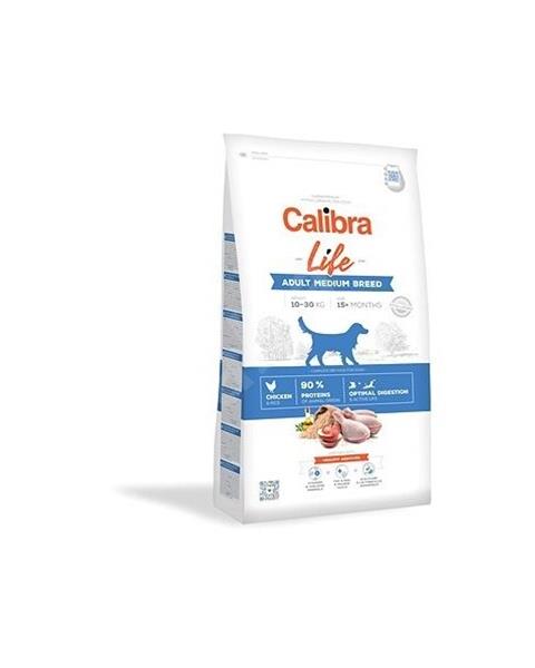 Calibra Dog Life Adult Medium Breed Chicken– kompletné superprémiové suché krmivo s vysokým obsahom kuracieho mäsa predospelé psy stredných plemien(10-30 kg). Základom tejto hypoalergénnej receptúry sú kvalitné živočíšne proteíny, ktoré tvoria 90 % z celkového obsahu bielkovín, a nízky obsah obilnín (iba ryža). Vďaka pridaným prebiotikám a probiotikám granuly vyhovujú potrebám na nastavenieoptimálneho trávenia.K posilneniuimunitného systémuďalej prispieva vybraný mix vitamínov a minerálov. Receptúra tak poskytuje významnú podporu pre aktívny život psa.