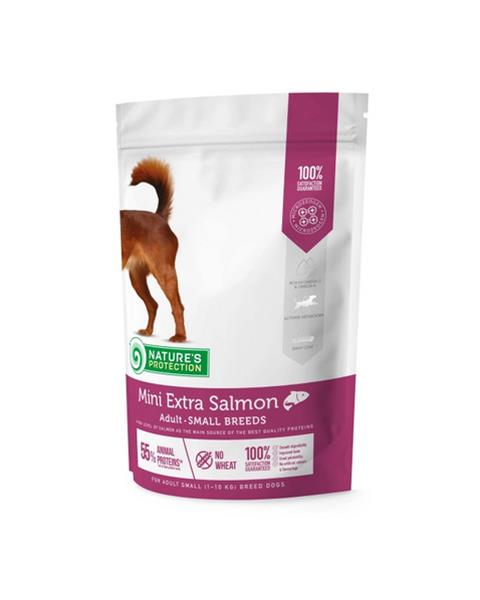 Nature's Protection Mini Extra Salmon pre dospelých psov malých plemien je super prémiové kompletné a vyvážené suché krmivo pre psov s najkvalitnejšími zdrojmi bielkovín a surovinami. Zloženie tohto suchého krmiva pre psov je obohatené o zložky, ktoré dokonale zabezpečujú potrebné množstvo kalórií, vitamínov a minerálov. Kompletné zloženie suchého krmiva pre psov poskytne vášmu domácemu miláčikovi nielen všetky účinné živiny, ale zabezpečí aj dokonalú stráviteľnosť, chutnosť a lesklú srsť.