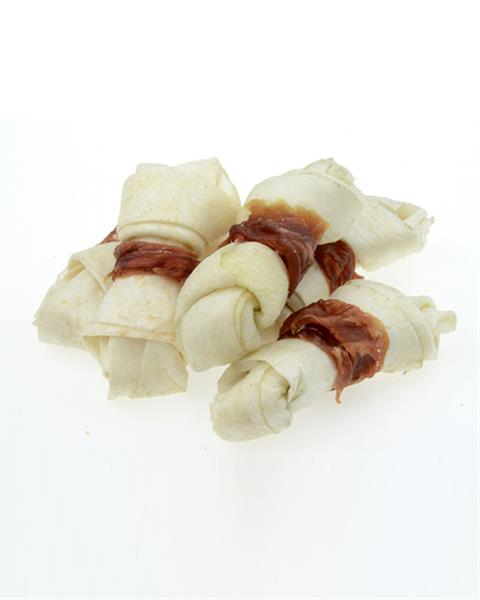 Zloženie:kačacie mäso 45%, byvolie kože 50%, kukuričný škrob 3%, konzervanty.